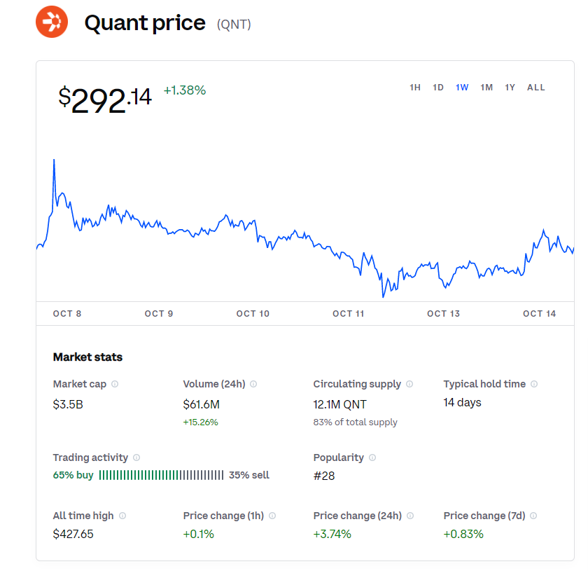 At the time of writing this article Quant has a price of about $292 and a market cap of $3.5 Billion. At this very moment QNT may not be the best cryptocurrency to buy. Overall currently the crypto market has gone up so if you’re looking to make some quick cash it may be better to wait for a little bit of time before buying any cryptocurrency as the market will likely go down in the next couple of days. Bitcoin has passed $57,000 so the whole market is up but it will likely go down from here. If you want to buy QNT it is less risky to wait a little bit and buy when the market comes back down.